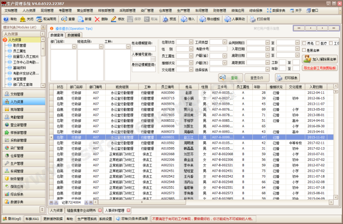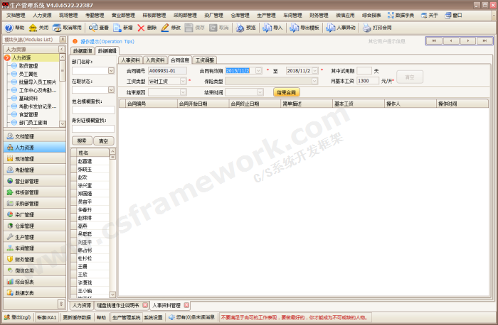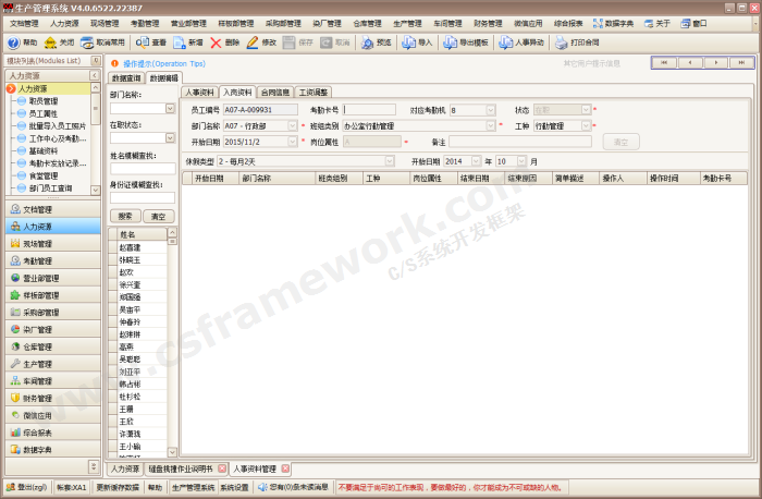 由珠海市喜鹊信息技术有限公司与2012年7月开始研发,2013年12月正式上线Beta版,上线过渡期2个月,共历时16个月,总投资180万。2014年4月开始研发染厂系统、验厂系统等2大子系统,客户追加投资53万。该ERP系统目前已平稳运行9年,人事、工资、考勤系统是ERP系统的3大子系统。目前该客户的工厂在职工人数1500人左右,年营业额2~5个亿,人事系统已登记在册员工数4200人。