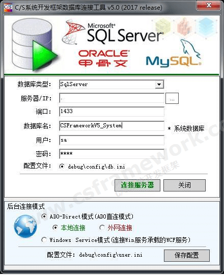 作为C/S系统快速开发平台配套工具之一,用于建立系统的初始连接以及配置后台连接模式。该工具支持SqlServer/Oracle/MySql三种数据库类型。用户使用开发框架之前,首先要配置连接CSFrameworkXX_System系统数据库,目的是建立初始连接,读取业务账套数据库的配置信息(tb_DataSet表),方便用户在系统登陆界面选择登陆账套。