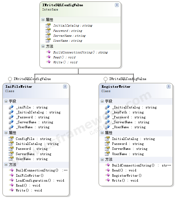 ![]() ![]() //存储SQL连接配置的接口 public interface IWriteSQLConfigValue { /// <summary> /// 写入SQL的连接配置信息 /// </summary> void Write(); /// <summary> /// 读取SQL的连接配置信息 /// </summary> void Read(); /// <summary> /// SQL Server Name/IP /// </summary> string ServerName { get; set; } /// <summary> /// 连接的数据库 /// </summary> string InitialCatalog { get; set; } /// <summary> /// 用户名 /// </summary> string UserName { get; set; } /// <summary> /// 密码 /// </summary> string Password { get; set; } /// <summary> /// 生成连接字符串 /// </summary> /// <returns></returns> string BuildConnectionString(); } // 来源:www.CSFramework.com, C/S结构框架学习网 连接参数保存在INI文件 //连接参数保存在INI文件 public class IniFileWriter : IWriteSQLConfigValue { #region IWriteConfigValue Members private string _iniFile; private string _ServerName; private string _Password; private string _UserName; private string _InitialCatalog; public IniFileWriter(string iniFile) { _iniFile = iniFile; if (!System.IO.File.Exists(iniFile)) Write(); Read(); } public string BuildConnectionString() { return new SqlConfiguration().GetConnectionString(this); } public void Read() { IniFile cfg = new IniFile(_iniFile); if (cfg != null) { _ServerName = cfg.IniReadValue("SQL Configuration", "SqlServer"); _InitialCatalog = cfg.IniReadValue("SQL Configuration", "database"); _UserName = cfg.IniReadValue("SQL Configuration", "SqlUser"); _Password = CEncoder.Decode(cfg.IniReadValue("SQL Configuration", "SqlPwd"));//解密 } } public void Write() { IniFile cfg = new IniFile(_iniFile); if (cfg != null) { cfg.IniWriteValue("SQL Configuration", "SqlServer", _ServerName); cfg.IniWriteValue("SQL Configuration", "Database", _InitialCatalog); cfg.IniWriteValue("SQL Configuration", "SqlUser", _UserName); cfg.IniWriteValue("SQL Configuration", "SqlPwd", CEncoder.Encode(_Password)); //加密 } } //配置文件 public static string ConfigFile { get { return Application.StartupPath "\\csframework3.ini"; } } //加载连接配置 public static void LoadConfiguration() { if (System.IO.File.Exists(ConfigFile)) { IWriteSQLConfigValue cfg = new IniFileWriter(ConfigFile); SqlConfiguration.SetSQLConfig(cfg); } else throw new Exception("Program cann't run without a SQL configuration.You should config the SQL connection by running CKG.TECH.Setup.exe!"); } public string InitialCatalog { get { return _InitialCatalog; } set { _InitialCatalog = value; } } public string ServerName { get { return _ServerName; } set { _ServerName = value; } } public string UserName { get { return _UserName; } set { _UserName = value; } } public string Password { get { return _Password; } set { _Password = value; } } #endregion } // 来源:www.CSFramework.com, C/S结构框架学习网 连接参数保存在注册表 //连接参数保存在注册表 public class RegisterWriter : IWriteSQLConfigValue { #region IWriteConfigValue Members private string _keyPath; private string _ServerName; private string _Password; private string _UserName; private string _InitialCatalog; //构造器 public RegisterWriter(string keyPath) { _keyPath = keyPath; Read(); } public string BuildConnectionString() { return new SqlConfiguration().GetConnectionString(this); } public void Read() { RegistryKey key = Registry.LocalMachine.CreateSubKey(_keyPath); if (key != null) { _ServerName = ConvertEx.ToString(key.GetValue("SqlServer", ".")); _InitialCatalog = ConvertEx.ToString(key.GetValue("SqlDatabase", "")); _UserName = ConvertEx.ToString(key.GetValue("SqlUser", "sa")); _Password = ConvertEx.ToString(key.GetValue("SqlPwd", "")); if (_Password != string.Empty) _Password = CEncoder.Decode(_Password); key.Close(); } } public void Write() { RegistryKey key = Registry.LocalMachine.CreateSubKey(_keyPath); if (key != null) { key.SetValue("SqlServer", _ServerName); key.SetValue("SqlDatabase", _InitialCatalog); key.SetValue("SqlUser", _UserName); key.SetValue("SqlPwd", CEncoder.Encode(_Password)); key.Close(); } } public string InitialCatalog { get { return _InitialCatalog; } set { _InitialCatalog = value; } } public string ServerName { get { return _ServerName; } set { _ServerName = value; } } public string UserName { get { return _UserName; } set { _UserName = value; } } public string Password { get { return _Password; } set { _Password = value; } } #endregion } // 来源:www.CSFramework.com, C/S结构框架学习网