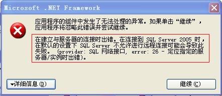 如下图所示,原因是连接字符串的服务器名或IP错误。比如:Server=.\SQLExpress; 而用户的机器没装SQLExpress实例,这时会出现下图错误。解决方法,将连接字串改为:Server=.;