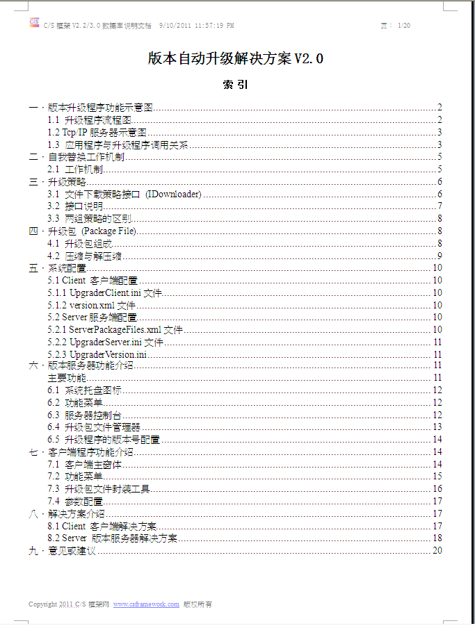 基于.Net C/S结构系统开发框架 - 标准版V2.2正式发布! 基于C#.NET C/S快速开发框架 - 代码自动生成功能 C#.Net C/S快速开发框架V2.2版本介绍 C#.Net C/S结构开发框架中BLL层的作用 C#.Net C/S结构开发框架中数据访问层(DAL)的作用 C#.Net局域网版本自动升级解决方案(原创) 《CS框架局域网版本自动升级解决方案》.doc C#.NET C/S结构版本自动升级解决方案2.0详解 (一) C#.NET C/S结构版本自动升级解决方案之流程图 C#.NET C/S结构版本自动升级解决方案之自我替换 C#.NET C/S结构版本自动升级解决方案之升级策略 C#.NET C/S结构版本自动升级解决方案之升级包实现 C#.NET C/S结构版本自动升级解决方案之TCP服务器 C#程序升级框架-软件版本自动升级系统|C/S框架网 Winform自动升级框架源码(C#.NET)-C/S框架网