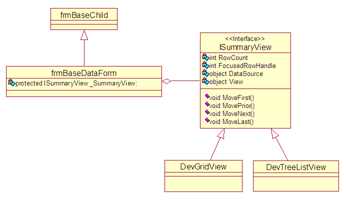 数据查询页面支持TreeList展示数据数据查询页面预设使用GridControl展示数据,考虑到不同的展示方式,将数据查询页与框架从业务逻辑独立出来。框架内设计一个接口:ISummaryView,它的主要职责是展示数据,在数据窗体定义一个受保护的接口类型成员变量_SummaryView,数据窗体直接调用该接口的方法。业务逻辑层取到数据直接交给ISummaryView展示数据,所以框架不关心具体的展示方式(或第三方数据控件),框架(数据窗体)只与ISummaryView接口紧密藕合,通过这个接口可以扩展出数种展示方式。 UML: C# Code: /// <summary> /// 支持数据操作功能的窗体基类. /// </summary> public partial class frmBaseDataForm : frmBaseChild, IDataOperatable, IPrintableForm { protected ISummaryView _SummaryView; } //来源:C/S框架网(www.csframework.com) QQ:1980854898 DevTreeListView 展示数据: C# Code: _SummaryView = new DevTreeListView(tlCategory);//每个业务窗体必需给这个变量赋值. DevGridView展示数据: C# Code: _SummaryView = new DevGridView(gvSummary);//每个业务窗体必需给这个变量赋值. ![]() 扫一扫加作者微信 ![]()