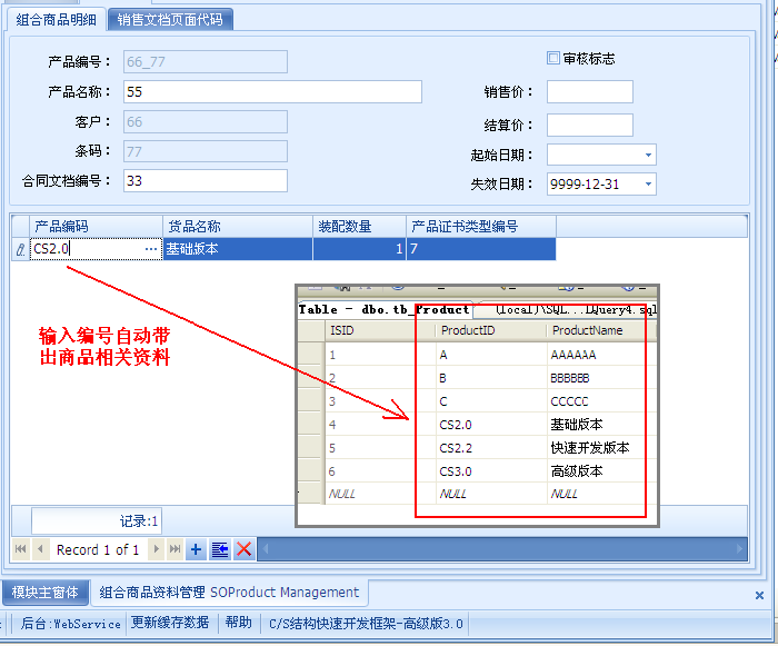 明细表使用ButtonEdit选择商品资料并设置商品名称,单价等信息如图: 基本思路: 1. 绑定ButtonEdit的Click,Validating事件。 2. 如用户Click,则打开商品查询窗体,当用户选择一个商品并关闭窗体,调用SearchStockCallBack方法设置商品资料相关字段的值。 3. 如用户输入编号,按回车时触发Validating事件,这时系统跟据bllProduct.GetDataByKey()从数据库取商品的资料,如编号正确,调用SearchStockCallBack()方法设置商品资料相关字段的值。 4. 商品名称必须为“Lookup ” 类型,因为业务单据的明细表只与商品编号关联,而商品名称是通过左联接(LEFT JOIN)查询出来的。新增的商品必须调用SearchStockCallBack方法给商品名称赋值,当存储数据后,下次修改时商品名称是LEFT JOIN查询出来的。 5. DAL层取业务单据的资料表(或主从关系的),建议将SQL封装为存储过程,DAL层不要写太多的SQL,将来不好维护。 部分源码: private void OnStockCode_ButtonClick(object sender, DevExpress.XtraEditors.Controls.ButtonPressedEventArgs e) { //打开商品查询窗体 frmFuzzySearch.Execute(sender as ButtonEdit, new bllProduct(), this.SearchStockCallBack); } //检查商品编号 private void OnStockCode_Validating(object sender, CancelEventArgs e) { if (this.IsAddOrEditMode == false) return; if (string.IsNullOrEmpty((sender as ButtonEdit).Text)) return; string stockCode = (sender as ButtonEdit).Text.Trim(); DataTable dt = new bllProduct().GetDataByKey(stockCode); //验证产品编号是否正确 if (dt.Rows.Count > 0) this.SearchStockCallBack(dt.Rows[0]); else { e.Cancel = true; Msg.Warning("产品编号不存在!"); } } private void SearchStockCallBack(DataRow resultRow) { if (resultRow == null) return; //给表格的字段赋值 int H = gvDetail.FocusedRowHandle; gvDetail.SetRowCellValue(H, colD_ProductID, ConvertEx.ToString(resultRow[tb_Product.ProductID])); gvDetail.SetRowCellValue(H, colD_ProductName, ConvertEx.ToString(resultRow[tb_Product.ProductName])); gvDetail.SetRowCellValue(H, colD_AssyNumber, 1); gvDetail.UpdateCurrentRow(); } 模板窗体: 参考开发框架销售订单(SO)的明细表处理机制。