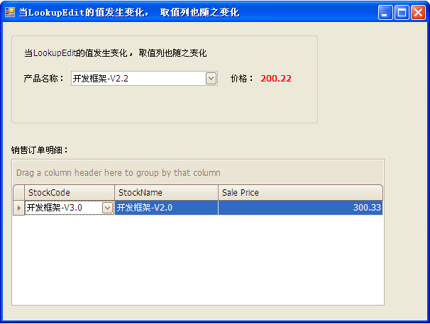 取LookupEdit组件数据源当前资料行某字段的值问题描述: 此窗体中的项目列绑定了LookupEdit组件,如何调用LookupEdit的事件,当LookupEdit的值发生变化,其取值列随之变化?就是(第四列的值是根据第二列的值发生变化的) 解决方案示例: 源码: C# Code: public partial class Form1 : Form { public Form1() { InitializeComponent(); } /// <summary> /// 产品数据 /// </summary> private DataTable StockData { get { DataTable dt = new DataTable(); dt.Columns.Add("StockCode", typeof(string)); dt.Columns.Add("StockName", typeof(string)); dt.Columns.Add("Price", typeof(decimal)); dt.Rows.Add(new object[] { "CS2.0", "开发框架-V2.0", 100.11 }); dt.Rows.Add(new object[] { "CS2.2", "开发框架-V2.2", 200.22 }); dt.Rows.Add(new object[] { "CS3.0", "开发框架-V3.0", 300.33 }); dt.AcceptChanges(); return dt; } } /// <summary> /// 销售订单明细数据 /// </summary> private DataTable SaleDetailData { get { DataTable dt = new DataTable(); dt.Columns.Add("StockCode", typeof(string)); dt.Columns.Add("StockName", typeof(string)); dt.Columns.Add("SalePrice", typeof(decimal)); dt.Rows.Add(new object[] { "CS2.0", "开发框架-V2.0", 100.11 }); dt.AcceptChanges(); return dt; } } private void Form1_Load(object sender, EventArgs e) { //绑定LookupEdit的数据源 txtStock.Properties.DisplayMember = "StockName"; txtStock.Properties.ValueMember = "StockCode"; txtStock.Properties.DataSource = StockData; //绑定表格中LookupEdit的数据源 RepositoryItemLookUpEdit edit = gridColumn1.ColumnEdit as RepositoryItemLookUpEdit; edit.Properties.DisplayMember = "StockName"; edit.Properties.ValueMember = "StockCode"; edit.Properties.DataSource = StockData; //手工绑定EditValueChanged事件 edit.EditValueChanged = new EventHandler(edit_EditValueChanged); //设置表格的数据源 gridControl1.DataSource = SaleDetailData; } private void edit_EditValueChanged(object sender, EventArgs e) { LookUpEdit edit = sender as LookUpEdit; if (edit.EditValue != null) { //取资料行,数据源为DataTable, 资料行是DataRowView对象。 object o = edit.Properties.GetDataSourceRowByKeyValue(edit.EditValue); if (o is DataRowView) { DataRowView rv = o as DataRowView; gridView1.SetFocusedRowCellValue("SalePrice", rv.Row["Price"]);//取单价 } } else { labelControl4.Text = "0.00"; } } private void txtStock_EditValueChanged(object sender, EventArgs e) { if (txtStock.EditValue != null) { //取资料行,数据源为DataTable, 资料行是DataRowView对象。 object o = txtStock.Properties.GetDataSourceRowByKeyValue(txtStock.EditValue); if (o is DataRowView) { DataRowView rv = o as DataRowView; labelControl4.Text = rv.Row["Price"].ToString(); //取单价 } } else { labelControl4.Text = "0.00"; } } } //来源:C/S框架网(www.csframework.com) QQ:1980854898 源码下载: