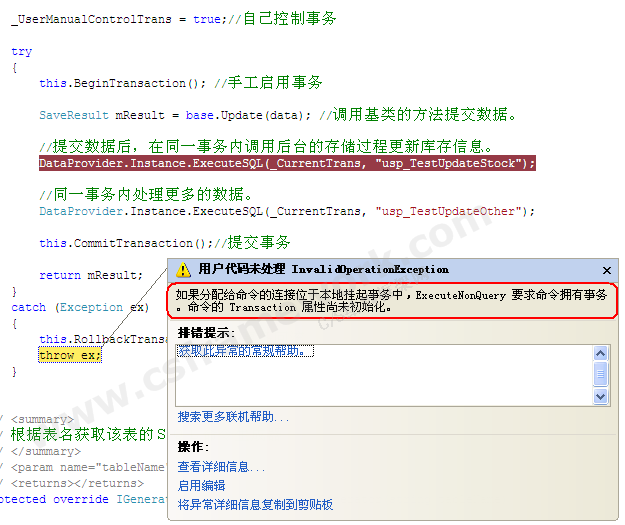 使用SqlCommand提交数据:命令的Transaction 属性尚未初始化出错信息:如果分配给命令的连接位于本地挂起事务中,ExecuteNonQuery 要求命令拥有事务。命令的 Transaction 属性尚未初始化。
