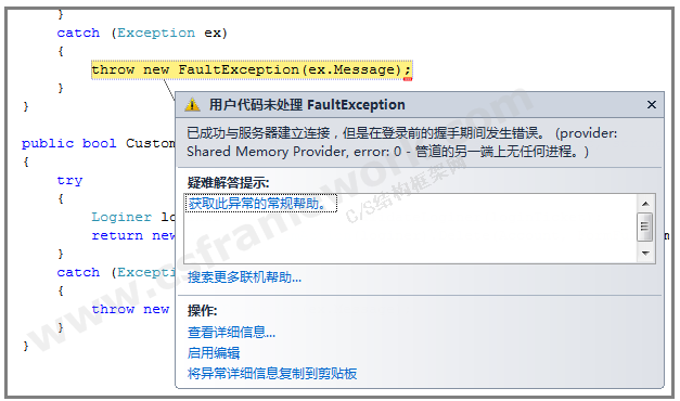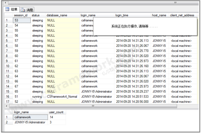 继续使用其它功能,比如打开新的功能窗体,执行查询等操作, 当打开数据字典的“客户管理”时,系统出现异常,如下图: ![]() 出现此异常的根本原因是连接池崩溃,超出最大连接数目。此时SQL管理器无法访问数据库, 必须重启SQL服务,释放所有连接。 测试结果:系统崩溃,SQL服务器崩溃 测试案例2 参数:将SQL连接池的最大并发连接数设为20。 目的:1.测试C/S系统开发框架消耗的连接数。2.恶意测试WCF服务及SQL连接池的承载能力。 点击数据字典模块的“测试连接池”按钮6次,共生成6000条记录,此时SQL连接池情况如下: ![]() csframework用户消耗连接池中14个连接, SQL管理器消耗连接池中3个连接(本人在SQL管理器中关闭了一个查询窗体)。 测试结果:系统运行正常 ![]() 扫一扫加微信 ![]()