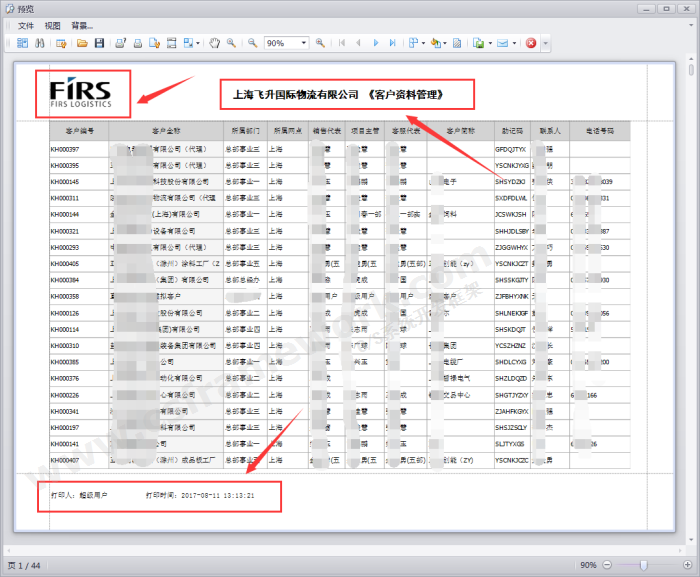DevExpress表格打印预览及自定义页眉页脚并绘制图片(C# Winform)![]() ![]() C# Code: private static void OnClick_PrintFile(object sender, EventArgs e) { GridControl gc = _Current.GridView.GridControl; //绑定表格组件 GridView gv = _Current.GridView; gv.OptionsPrint.AutoWidth = false; //实例化打印组件 PrintableComponentLink link = new PrintableComponentLink(new PrintingSystem()); link.Component = gc; link.Landscape = true; link.PaperKind = System.Drawing.Printing.PaperKind.A4; link.CreateMarginalHeaderArea = Link_CreateMarginalHeaderArea; link.CreateDocument(); link.ShowPreview(); } //来源:C/S框架网(www.csframework.com) QQ:1980854898 C# Code: private static void Link_CreateMarginalHeaderArea(object sender, CreateAreaEventArgs e) { GridControl gc = _Current.GridView.GridControl; //绑定表格组件 //LOGO e.Graph.DrawImage(global::UYouTMS.Library.Properties.Resources.firs_logo2, new RectangleF(0, 0, 110, 57), DevExpress.XtraPrinting.BorderSide.None, Color.White); //报表标题 string title = gc.FindForm().Text; title = "上海飞升国际物流有限公司 《" title "》"; PageInfoBrick brick = e.Graph.DrawPageInfo(PageInfo.None, title, Color.Black, new RectangleF(120, 0, 400, 30), DevExpress.XtraPrinting.BorderSide.None); brick.LineAlignment = BrickAlignment.Center; brick.Alignment = BrickAlignment.Center; brick.AutoWidth = false; brick.Font = new Font("黑体", 13f, FontStyle.Bold); //打印时间信息 string text = String.Format("打印人:{0} 打印时间:{1}", Loginer.CurrentUser.AccountName, DateTime.Now.ToString("yyyy-MM-dd HH:mm:ss")); DevExpress.XtraPrinting.PageHeaderFooter P = new PageHeaderFooter(); P.Footer.Content.Add(text); P.Footer.LineAlignment = BrickAlignment.Center; (sender as PrintableComponentLink).PageHeaderFooter = P; } //来源:C/S框架网(www.csframework.com) QQ:1980854898