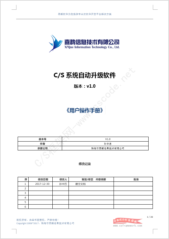 C#程序升级框架-软件版本自动升级系统|C/S框架网一、系统简介: 软件自动升级程序帮助开发者将桌面管理软件升级到最新版本,可以轻松实现多渠道的同步更新,是进行存量用户更新的有效手段。使用自动更新程序后(即客户端已经部署升级程序以及集成了自动更新接口),当用户启动应用程序时,自动更新程序会将用户终端上的版本信息与服务器上开发者上传的升级包版本信息进行比较,如果服务器的版本更高,则会提示用户有新的版本更新,用户选择更新之后,则开始下载升级包,然后替换旧的版本。 ![]() 二、网络环境及运行环境: 支持局域网、广域网网络环境运行。基于Windows操作系统设计与运行,开发工具使用VS2013,VS2015或更高版本,数据库支持Microsoft SQL Server 2005、2008或更高版本。 开发工具:VS2013 / VS2015 程序语言:C#.NET .Net Framework版本: 2.0~4.5 数据库:Microsoft SQL Server 2005 / 2008 三、软件自动升级流程图: ![]() 四、C#程序升级框架客户端: C/S程序自动升级是一个很重要的功能,原理其实很简单,一般包含两个程序,一个是主程序,也就是除了升级功能以外的程序,另一个就是升级程序。在客户端程序启动时,先启动更新程序通过比较本地版本和服务端最新的版本信息判断是否有新版本,如果有可以直接下载,下载完成替换成功后并更新客户端版本信息,启动主程序。 ![]() C#程序升级框架客户端有两大功能: 1. 升级包发布功能:开发人员使用客户端发布升级程序EXE文件以及升级包到服务器。 2. 自动升级功能:运行主程序(如:ERP/MES系统),系统自动调用升级程序从服务器下载升级包。 五、升级包模型图: ![]() 升级包由封包工具生成的,每个升级包对应唯一的版本号,升级包由多个文件组成,使用对象持久技术 序列化为byte数据存储在数据库或保存为一个文件。 升级包数据传输是通过ADO.NET组件或WCF通信将升级包数据提交到服务器,或从服务器下载升级包到本地。 六、C#程序升级框架解决方案: ![]() 七、C#程序升级框架《详细设计说明书》: ![]() ![]() ![]()