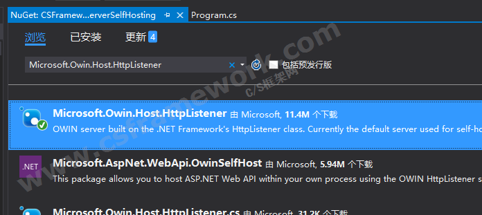 工程项目-->鼠标右键-->管理Nu程序包-->浏览-->输入:Microsoft.Owin.Host.HttpListener-->安装。