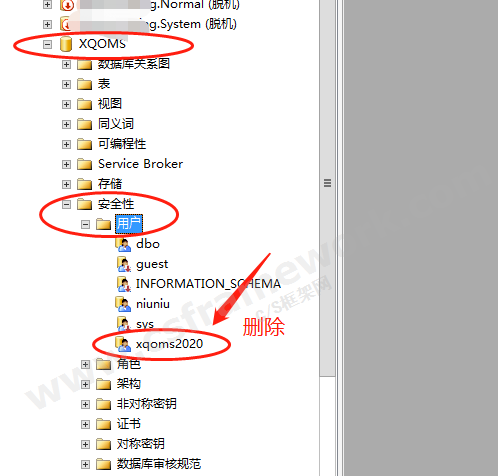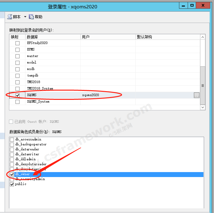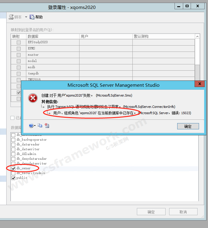 把当前数据库(如XQOMS)中的xqoms2020用户删除,然后再设置db_owner角色就可以的。