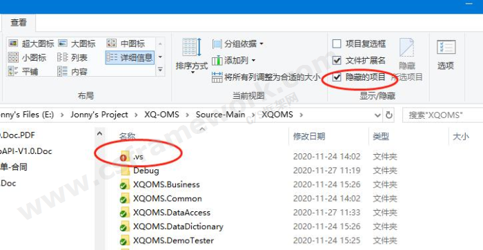 若看不到.vs目录,勾选【隐藏的项目】,如下图所示:
