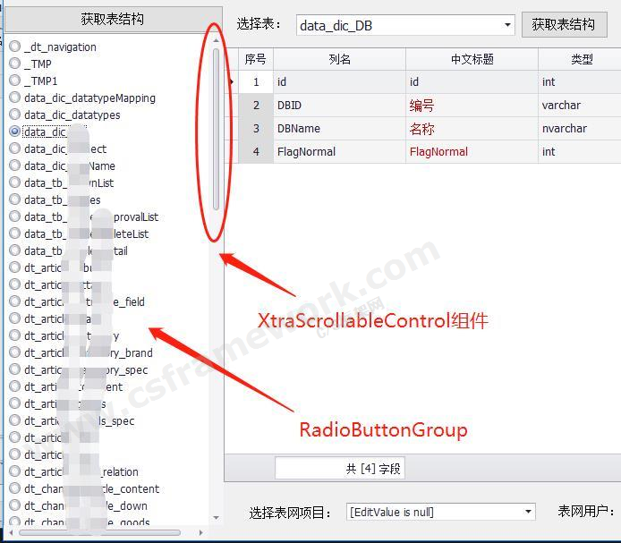 DevExpress XtraScrollableControl与RadioGroup组合支持滚动单选项列表![]() C# Code: //加载表名到RadioGoup组件 listTables.Properties.Items.Clear(); foreach (DataRow r in dt.Rows) { listTables.Properties.Items.Add(new RadioGroupItem { Description = r["TableName"].ToString(), Value = r["TableName"].ToString(), }); } listTables.Dock = DockStyle.None; listTables.Properties.Columns = 1;//设置1列,即为列表样式 listTables.Properties.ItemsLayout = RadioGroupItemsLayout.Column; //重要!!!设置RadioGroup组件顶部的位置,DisplayRectangle.Y为负数,为垂直滚动状态。 listTables.Top = xtraScrollableControl1.DisplayRectangle.Y; listTables.Left = 0; listTables.Width = listTables.Parent.Width; listTables.Height = dt.Rows.Count * 20; listTables.Focus();//自动滚动到顶部 //来源:C/S框架网 | www.csframework.com | QQ:23404761 注意下面这段代码!!! 当用户滚动列表到最下面的时候,重新加载列表数据,组件会偏移(上面的位置是空白)。 C# Code: //重要!!!设置RadioGroup组件顶部的位置,DisplayRectangle.Y为负数,为垂直滚动状态。 listTables.Top = xtraScrollableControl1.DisplayRectangle.Y; ![]() 扫一扫加微信 ![]()