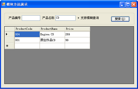 public partial class frmProduct : CSFramework.TemplateMethodDemo.frmBase { public frmProduct() { InitializeComponent(); } //复写(Override)模块方法,具体实现 protected override DataTable DoSearch() { return new BLL_Product().Search(txtProductCode.Text, txtProductName.Text); } } 搜索功能在窗体基类实现了,我们只需要定义具体的数据查找方法。 通过重写DoSearch模块方法,从业务逻辑层返回数据。 /// <summary> /// 业务逻辑层 /// </summary> public class BLL_Product { public DataTable Search(string productCode, string productName) { string where = " 1=1 "; if (!String.IsNullOrEmpty(productCode)) where = where + " and ProductCode=’" + productCode + "’"; if (!String.IsNullOrEmpty(productName)) //支持模糊查找 where = where + " and ProductName like ’%" + productName + "%’"; string sql = "select * from tb_Product where " + where; //从SQL Server 获取数据 ..........省略........... // //下面返回测试数据 DataTable test = this.GetDemoData();//返回测试数据 DataRow[] rows = test.Select(where); //克隆 System.Data.DataTable 的结构,包括所有 System.Data.DataTable 架构和约束。 DataTable retTable = test.Clone(); foreach (DataRow row in rows) retTable.ImportRow(row); return retTable; } /// <summary> /// 构建测试数据表 /// </summary> /// <returns></returns> private DataTable GetDemoData() { DataTable dt = new DataTable(); dt.Columns.Add("ProductCode", typeof(String)); dt.Columns.Add("ProductName", typeof(String)); dt.Columns.Add("Price", typeof(Decimal)); dt.Rows.Add("001", "原创作品CD", 99); dt.Rows.Add("002", "Dev Express 9.2x Suit", 9960); dt.Rows.Add("003", "可口可乐", 1.90); dt.Rows.Add("004", "Engima CD", 269); return dt; } } ![]() 扫一扫加微信 ![]() 如转载请注明出处,C/S框架网 www.csframework.com