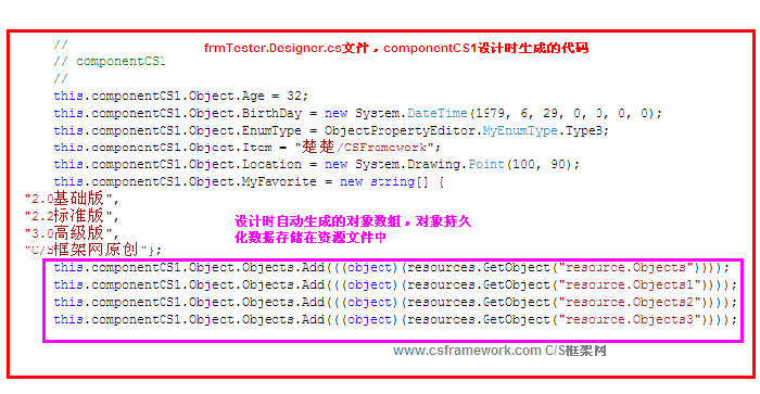 设计时自动生成的对象数组,对象持久化数据存储在资源文件中,xx.Designer.cs文件。