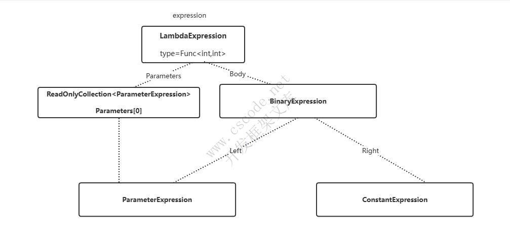 而有意思的是二元表达式树BinaryExpression是一个二叉树,而LambdaExpression则是一个支持参数的表达式,能够通过其Parameters属性知道传入的参数的类型和数量,通过ReturnType知道返回值是什么类型
