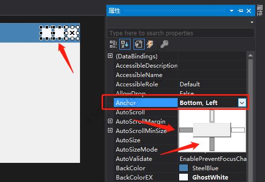 将基类窗体的按钮或组件的Anchor属性设置为:Buttom, Left,如下图所示: