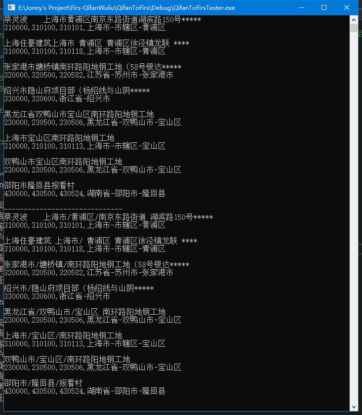 Test2(dict, "上海住豪建筑 上海市/ 青浦区 青浦区徐泾镇龙联 ****");