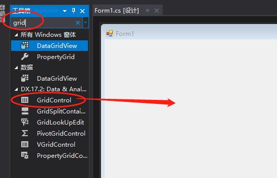 DevExpress版本低于v17.x或升级更高版本的用户请注意打开 CSFramework.GenericImporter项目下Form1,在工具箱搜索 grid,拖放一个GridControl 组件到 界面