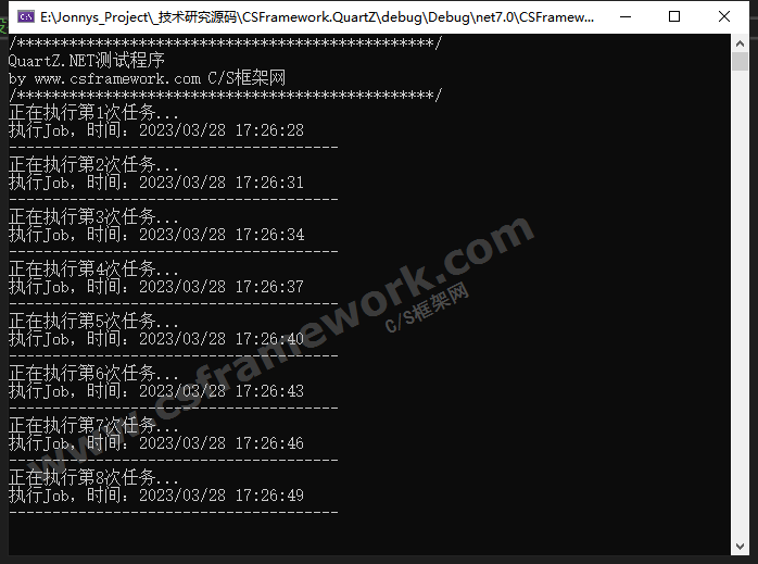 C#+VS2022+Quartz.NET 3.6.2 自动任务作业调度框架测试![]() Quartz.NET简介 Quartz.NET是一个开源的作业调度框架,是OpenSymphony 的 Quartz API的.NET移植,它用C#写成,可用于winform和asp.net应用中。它提供了巨大的灵活性而不牺牲简单性。你能够用它来为执行一个作业而创建简单的或复杂的调度。它有很多特征,如:数据库支持,集群,插件,支持cron-like表达式等等。 测试环境 VS2022, C# Console控制台 .NET7 测试结果 ![]() C#源码 C# Code: using CSFramework.QuartZ; Console.WriteLine("/************************************************/"); Console.WriteLine("QuartZ.NET测试程序"); Console.WriteLine("by www.csframework.com C/S框架网"); Console.WriteLine("/************************************************/"); //运行测试程序 TestQuartz.Run(); //注意:这里使用ReadLine方法,否则控制台没有输出任何信息,以为程序执行失败! Console.ReadLine(); //来源:C/S框架网 | www.csframework.com | QQ:23404761 C# Code: /// <summary> /// www.csframework.com,测试QuartZ.NET /// </summary> public class TestQuartz { /// <summary> /// 运行测试程序 /// </summary> public static async void Run() { //1.调度工厂//创建任务调度器 StdSchedulerFactory factory = new StdSchedulerFactory(); IScheduler scheduler = await factory.GetScheduler(); //2.启动任务调度器 await scheduler.Start(); //3.创建一个触发条件(配置任务的参数),每3秒执行一次任务,永不停止。 ITrigger trigger = TriggerBuilder.Create() .WithSimpleSchedule(x => { x.WithIntervalInSeconds(3).RepeatForever(); }) .Build(); //4.创建一个任务 IJobDetail job = JobBuilder.Create<TestJob>() .WithIdentity("job", "group") .Build(); //将创建的任务和触发器条件添加到创建的任务调度器当中 await scheduler.ScheduleJob(job, trigger); } } //来源:C/S框架网 | www.csframework.com | QQ:23404761 C# Code: [DisallowConcurrentExecution] public class TestJob : IJob { private static int _Count = 0; private static object _lock = new object(); [MethodImpl(MethodImplOptions.Synchronized)] public virtual Task Execute(IJobExecutionContext context) { lock (_lock) { _Count++; } Console.WriteLine($"正在执行第{_Count}次任务..."); Console.Out.WriteLineAsync($"执行Job,时间:{DateTime.Now}"); Console.WriteLine("--------------------------------------"); return Task.CompletedTask; } } //来源:C/S框架网 | www.csframework.com | QQ:23404761 ![]() 扫一扫加作者微信 ![]()