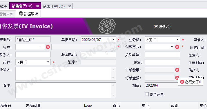 保存资料校验判断输入是否有效(IsInvalid)CommonTools.IsInvalid 方法 保存资料前需要对输入项进行检查,检查不通过,文本框右侧显示红色X图标,如下图: ![]() C# 代码: C# Code: /// <summary> /// 检查文本框资料是否无效 /// </summary> /// <param name="edit">文本框</param> /// <param name="errorText">提示消息</param> /// <param name="ruler">数字类型文本框校验规则</param> /// <returns></returns> public static bool IsInvalid(BaseEdit edit, string errorText = "不能为空", IntRuler ruler = IntRuler.不判断) { edit.ErrorText = ""; if (edit.Visible == false) return false; //隐藏的控件不处理 //数字类型 if ((edit.EditValue == DBNull.Value || edit.EditValue is Int32 || edit.EditValue is Decimal || edit.EditValue is Single || edit.EditValue is Double || edit.EditValue is int || edit.EditValue is float) && ruler != IntRuler.不判断) { bool valid = true; switch (ruler) { case IntRuler.大于0: valid = edit.EditValue.ToStringEx().ToDecimal() > 0; errorText = "必须大于0"; break; case IntRuler.等于0: valid = edit.EditValue.ToStringEx().ToDecimal() == 0; errorText = "必须等于0"; break; case IntRuler.小于0: valid = edit.EditValue.ToStringEx().ToDecimal() < 0; errorText = "必须小于0"; break; } if (valid == false) { edit.ErrorIconAlignment = ErrorIconAlignment.MiddleRight; edit.ErrorText = errorText; return true; } } //日期时间 if (edit is DateEdit editor) { if (editor.DateTime == DateTime.MinValue || edit.Text.IsEmpty()) { if (String.IsNullOrWhiteSpace(errorText)) errorText = "不能为空"; edit.ErrorIconAlignment = System.Windows.Forms.ErrorIconAlignment.MiddleRight; edit.ErrorText = errorText; return true; } } //字符或其他 if (edit.EditValue.IsEmpty()) { if (String.IsNullOrWhiteSpace(errorText)) errorText = "不能为空"; edit.ErrorIconAlignment = System.Windows.Forms.ErrorIconAlignment.MiddleRight; edit.ErrorText = errorText; return true; } return false; } //来源:C/S框架网 | www.csframework.com | QQ:23404761 使用: C# Code: //多个输入项检查。若检查不通过,文本框右侧显示红色X图标 var isInvalid = false | CommonTools.IsInvalid(txtDocDate) | CommonTools.IsInvalid(txtCustomerCode) | CommonTools.IsInvalid(txtSalesId) | CommonTools.IsInvalid(txtCurrency) | CommonTools.IsInvalid(txtPaymentType) | CommonTools.IsInvalid(txtTotalQuantity, "", IntRuler.大于0) | CommonTools.IsInvalid(txtTotalAmount, "", IntRuler.大于0); if (isInvalid) return false; //来源:C/S框架网 | www.csframework.com | QQ:23404761 ![]() 扫一扫加作者微信 ![]()