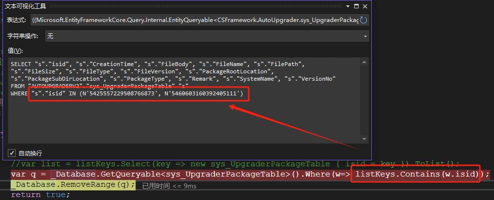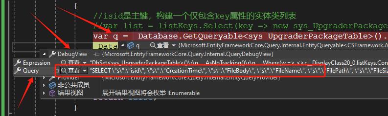 EFCore+LINQ 使用DebugView查看LINQ转译后的原生SQL LINQ查询C# 全选 设断点跟踪Query在GetQueryable<T>代码行设置断点,程序运行到断点行按F10到下一行,然后把鼠标放到q上面。