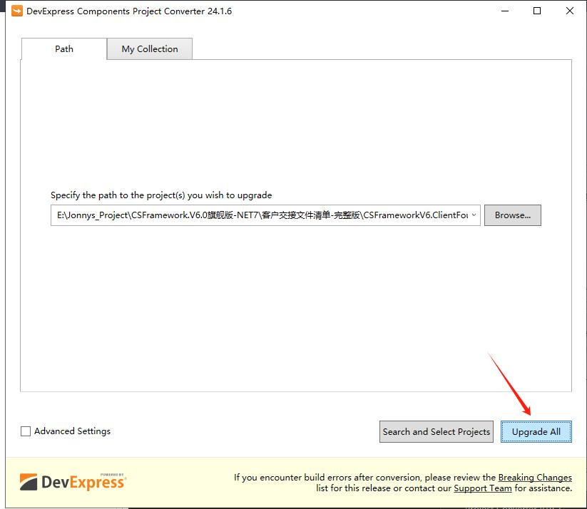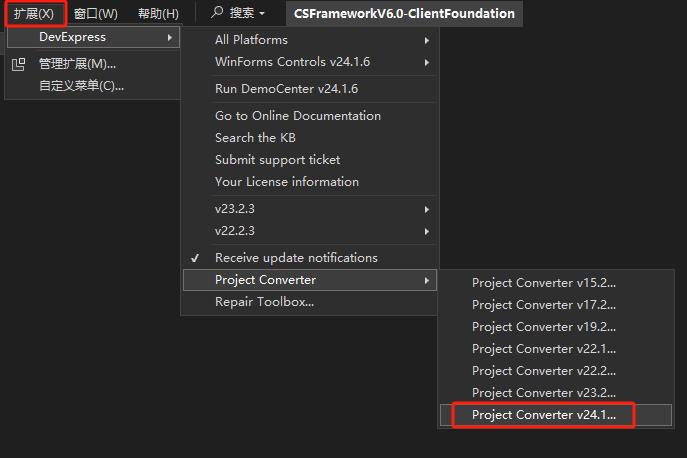 CSFrameworkV6开发框架升级VS2022+.NET8+DevExpress24.1操作步骤 目录一、DevExpress官网下载 DevExpress24.1Thank you for Downloading | DevExpress 二、VS解决方案升级到DevExpress24.1打开解决方案:CSFrameworkV6.0-ClientFoundation.sln 主菜单扩展->DevExpress->Project Converter -> Project Converter v24.1