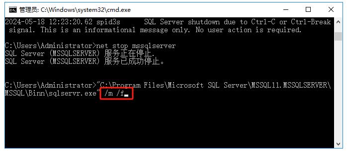 拖拽sqlservr.exe 到 cmd窗体,在后面添加 /m /f 两个参数,按回车键