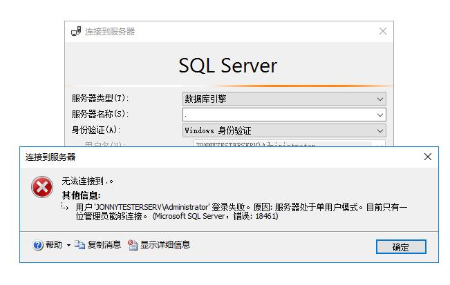 在MSSMS内误删了Windows验证的登录用户,如:hostname\Administrator用户,而SA用户是禁用状态,导致无法使用Windows身份验证登录。